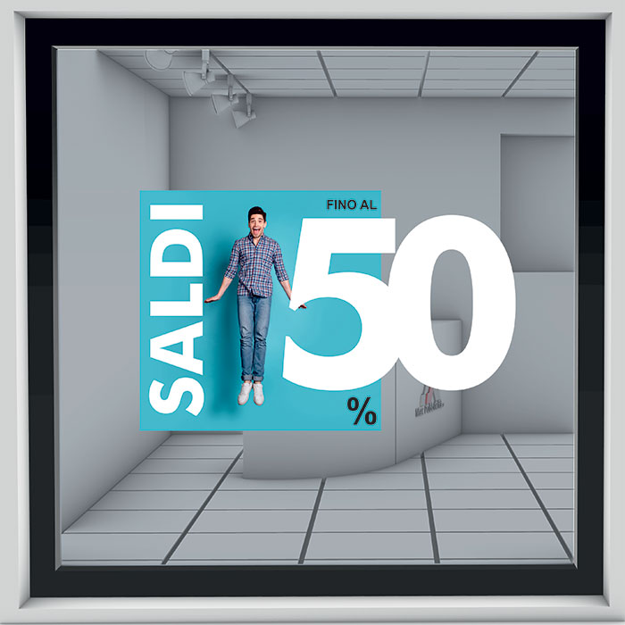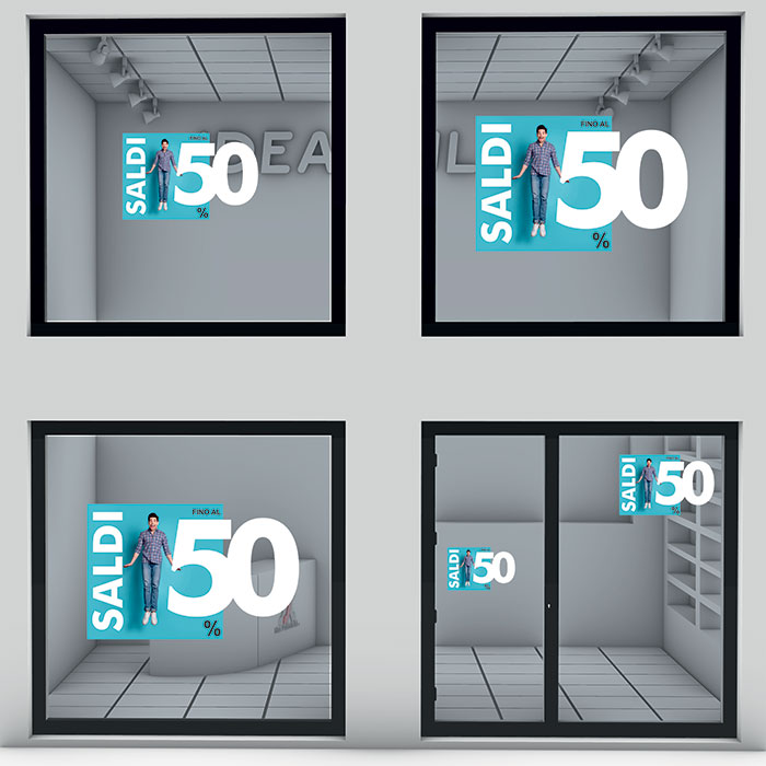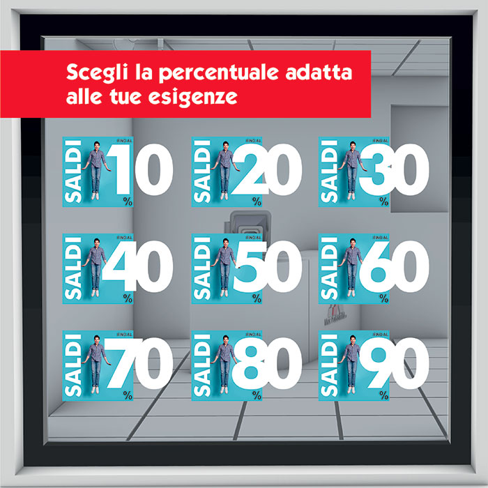 Adesivo da esterno monomerico per vetrofania Saldi con percentuale personalizzabile.