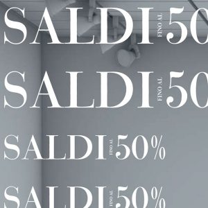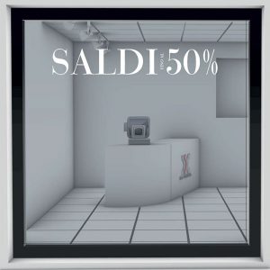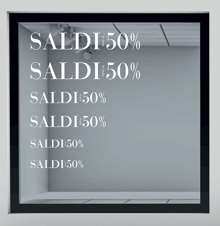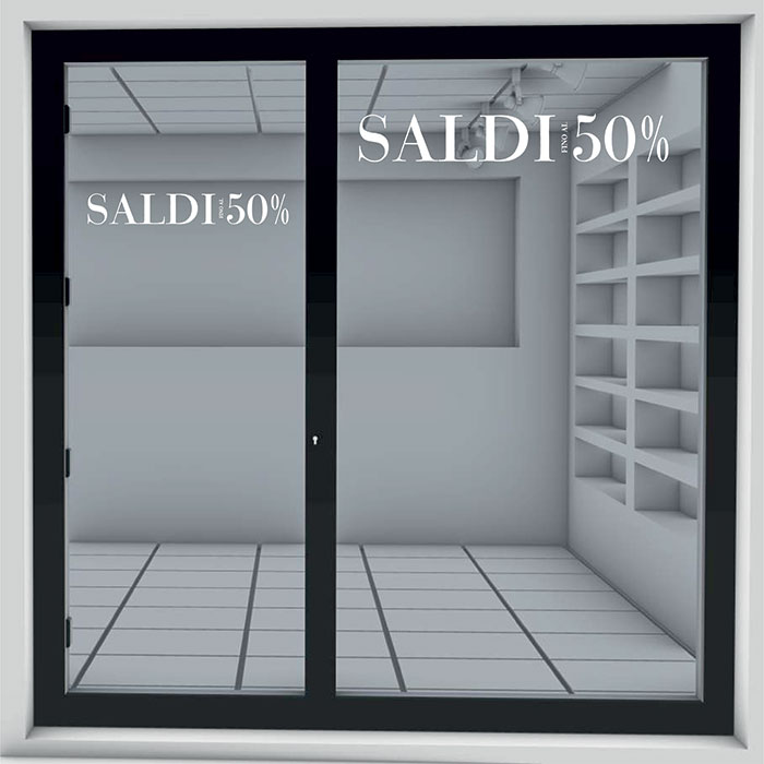 Adesivo da esterno in vinile prespaziato per vetrofania con scritta Saldi.