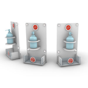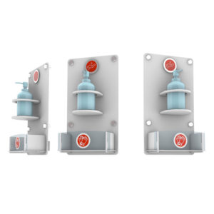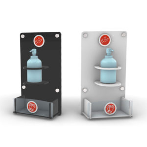 Porta dispenser per gel disinfettante da muro in plexiglass. Di facile montaggio, il prodotto è dotato di quattro distanziatori argentati satinati da applicare alla parete. Le due icone posizionate sull’espositore richiamano il “GEL e GUANTI POINT” presente nel locale.