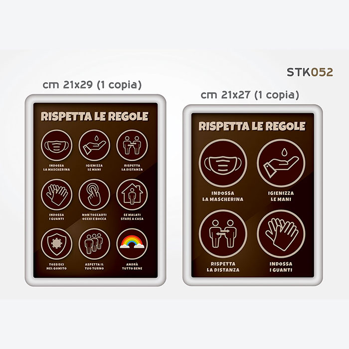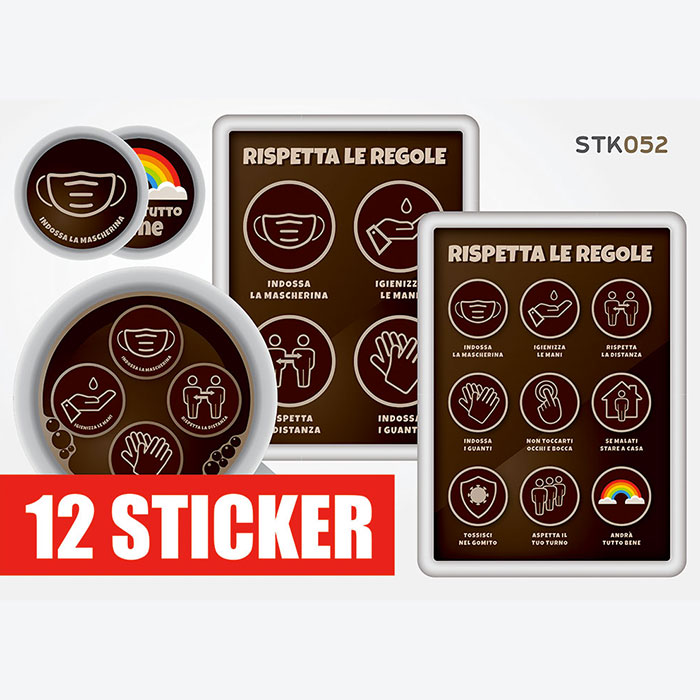 Questo kit di adesivi, composto da 12 pezzi, è ideale per informare la clientela sulle misure da rispettare all’interno del locale. La versatilità e la quantità dei prodotti presenti nell’offerta, permettono la loro applicazione sia all’esterno (vetrina) che all’interno (muro, bancone, parafiato, mobili).